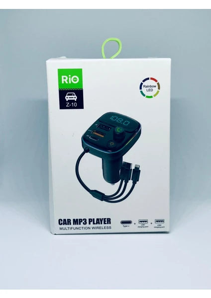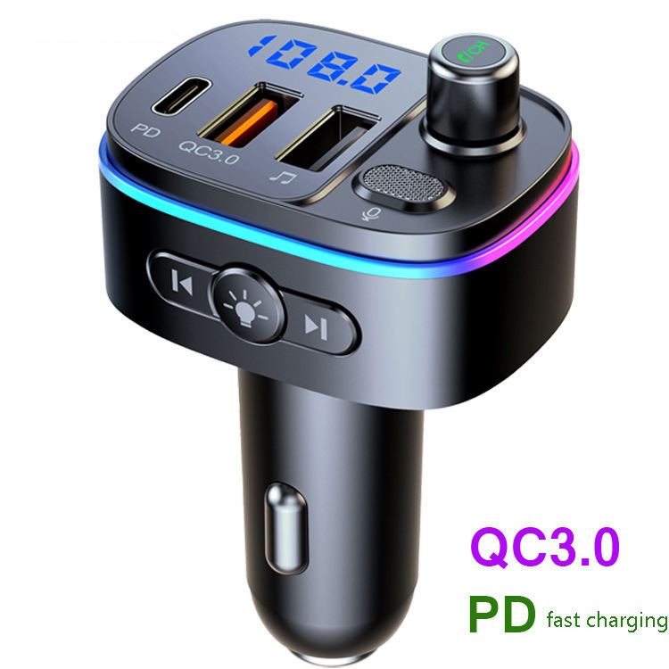 Transmetteur FM auto multifonction avec Bluetooth 5.0, ports USB QC3.0 + Type-C + Lightning, slot TF et éclairage LED arc-en-ciel – Musique et charge rapide en conduite